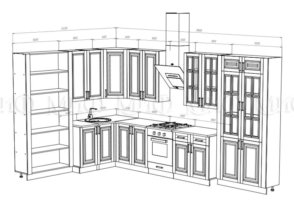 • Общие габариты Ширина 2400 х 3800 мм  x Глубина 600 (мм) по столешнице х Высота 850 (мм)